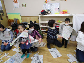 ビリビリ破いたり、丸めたりして、おうちの人から新聞